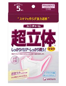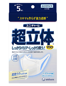 即納できます!【お一人様5個まで】ユニチャーム 超立体マスク かぜ用ふつうサイズ 5枚入り 価格: 499円 レビュー評価: 0.0 レビュー数:0 商品名超立体マスクかぜ用内容量5枚入り特徴■三層構造の高密度フィルターが、飛沫ウイルスの侵入をしっかりブロックします。 ■「ノーズフィット」搭載の超立体構造でピッタリフィットするので、どこにもスキマを作らず、飛沫ウイルスの侵入を全面遮断します。 ■バリア性と通気性を両立した新発明“超息ラクフィルター”と口元の空間により、ぴったりフィットするのに呼吸が楽にできます。しゃべりやすく、口紅うつりの心配もありません。 ■口元にできる立体空間で湿度を保つ効果があるので、乾燥を防ぎのどにうるおいをあたえます。 ■伸縮性に優れた柔らかい不織布定価520円製造・販売ユニ・チャーム株式会社お問合せ0120-04 Supported by 楽天ウェブサービス |